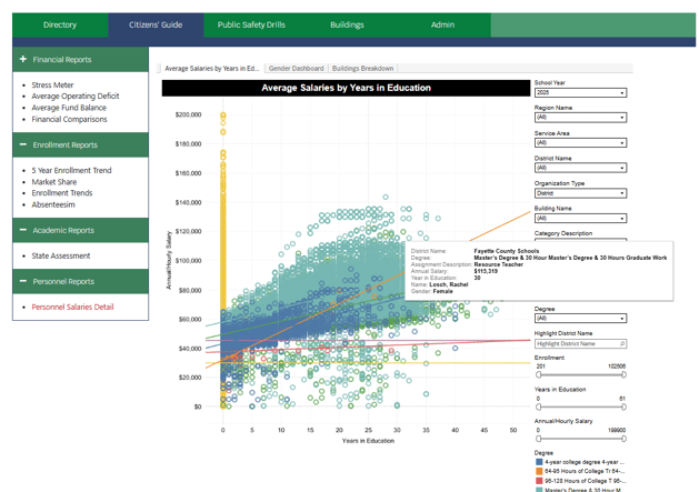 Updated the Personnel Salaries Detail report for Kentucky, in the Eastern Region dashboard. To navigate to this, in the breadcrumbs in the blue bar at the top of the page, click NKCES. Then click the Citizen's Guide tab. Under Personnel Reports in the left menu, click Personnel Salaries Detail.